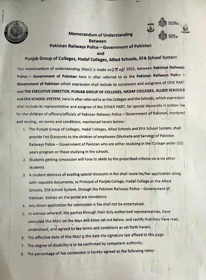 Inspector General of Pakistan Railways Police has signed the following MoU's with different educational state institutions and NGO's for employees and families of railways police.
